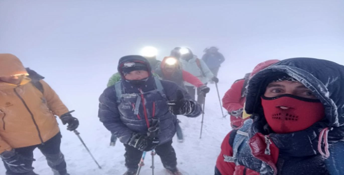 Doğa tutkunları, günlerce süren zorlu yolculuğun ardından günün ilk ışıklarıyla zirveye adım atıyor ve Ağrı Dağı'nın zirvesine çıkmanın sevincini yaşıyorlar.