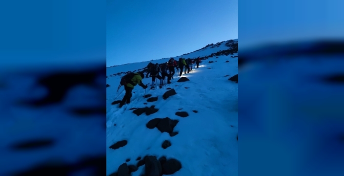 Tırmanış, yerel rehber Cuma Saltık öncülüğünde başladı. Dağcıların karla kaplı zorlu araziye rağmen yürüyüşlerini sürdürdüğü görüldü.