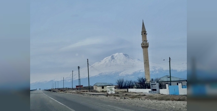 Yol boyunca sürücülere manzarasıyla eşlik eden Ağrı Dağı, bölgedeki tepelerin arasında ihtişamıyla yükseliyor.