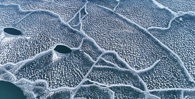 Hava sıcaklığının gece eksi 10 derecenin altına düştüğü bölgede buzla kaplanan Nazik Gölü'nün değişik desenlere bürünen yüzeyi havadan drone ile görüntülendi.