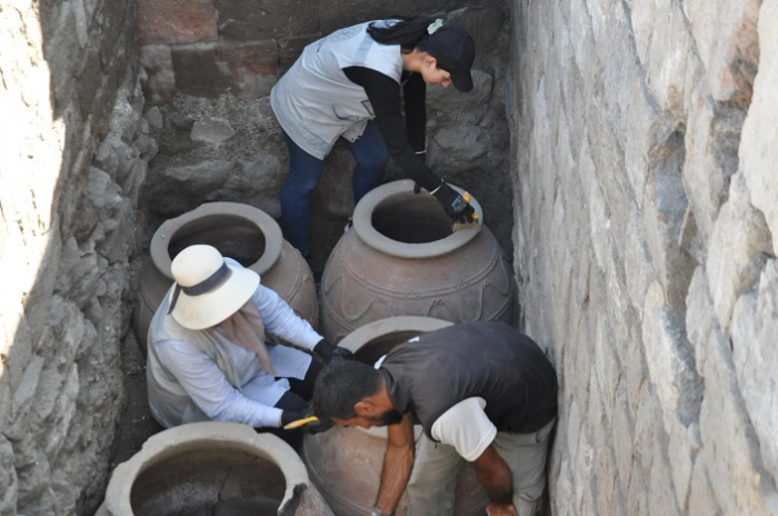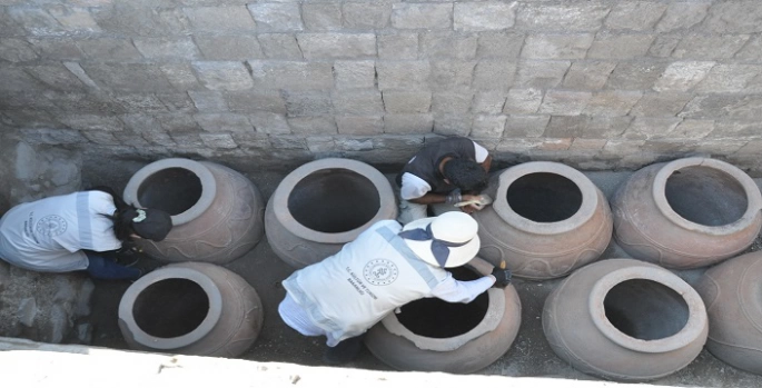 Geçtiğimiz günlerde ortaya çıkarılan İlk Kaya Mescidi'nin ardından şimdi de yürütülen çalışmalarda Büyük Selçuklu dönemine tarihlenen erzak deposu içerisinde yaklaşık 1,5 metre yüksekliğe sahip 8 küp gün yüzüne çıkarıldı.
