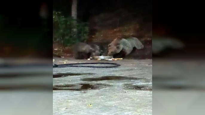 Ayı, bu kez 3 yavrusunu da alıp aynı yere geldi. Uzun süre tepsi içerisindekileri yiyen anne ayı ve yavruları ardından ormanlık alana girerek gözden kayboldu.