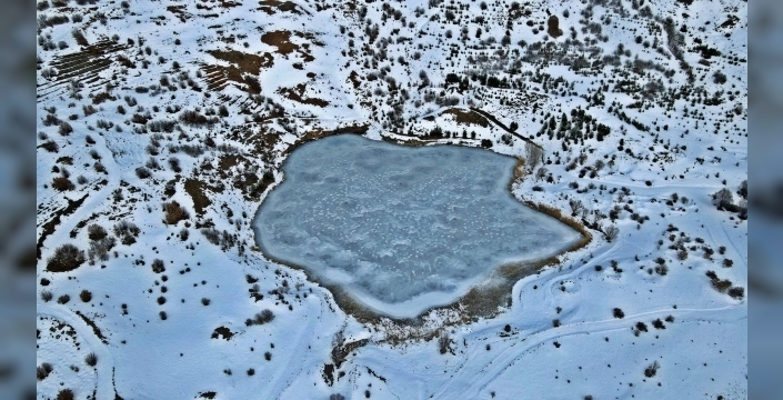 Erzincan’ın Kemah ilçesine bağlı Beşikli köyünde yer alan Ardos Gölü, etkili olan soğuk hava nedeniyle dondu. Deniz seviyesinden bin 660 metre yükseklikte bulunan göl, drone ile havadan görüntülendi.