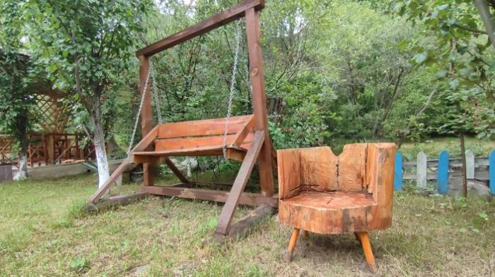 Bahçede, salıncaklar, kamelyalar, çardaklar ve kütükten yapılmış masa, sandalyeler gibi birçok ahşap eşya bulunuyor. Bu eşyaların tamamı, Aşur Taş'ın el emeği ile ortaya çıkmış. Hatta lavabo önünde bulunan lavabo, musluk ve ayna gibi malzemeler bile ahşaptan üretilmiş durumda.