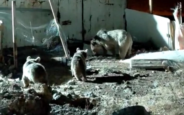SERHED HABER- Hakkari'nin Yüksekova ilçesine bağlı Dağlıca köyündeki bir şantiyeye inen ayı ve yavrularının yiyecek aradığı anlar cep telefonu kamerasına yansıdı.