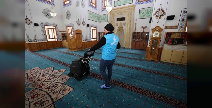 Belediye ekipleri tarafından yürütülen çalışmalar kapsamında camilerin iç ve dış temizliği titizlikle yapılırken, aynı zamanda halılar yıkanıyor ve ortak kullanım alanları da dezenfekte ediliyor.