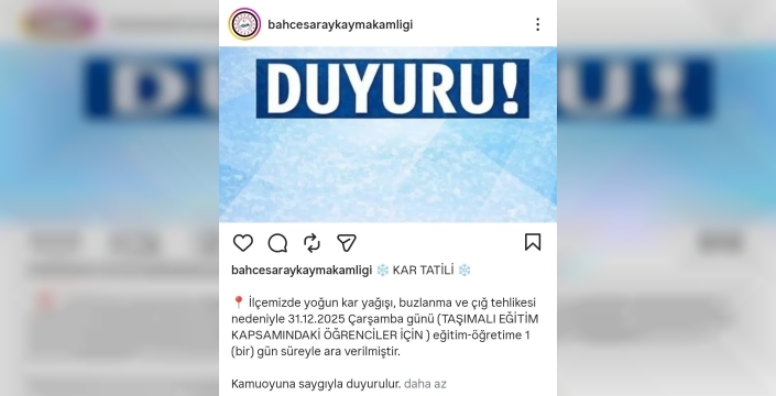 Bahçesaray Kaymakamlığı tarafından sosyal medya hesaplarından yaptığı paylaşımda, "İlçemizde yoğun kar yağışı, buzlanma ve çığ tehlikesi nedeniyle 31 Aralık 2025 Çarşamba günü taşımalı eğitim kapsamındaki öğrenciler için eğitim-öğretime 1 gün süreyle ara verilmiştir" ifadelerine yer verildi