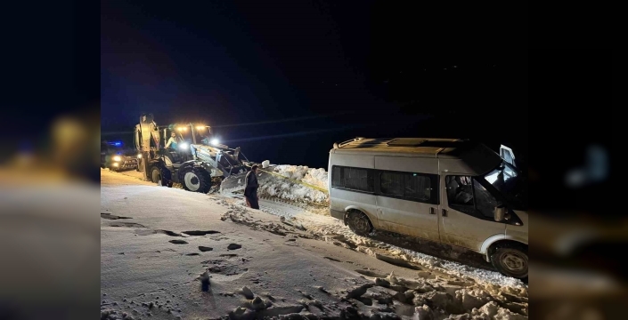 Van’ın Başkale ilçesinde kar yağışı ve tipinin etkisiyle yoldan çıkan minibüs kar birikintisine saplandı.
