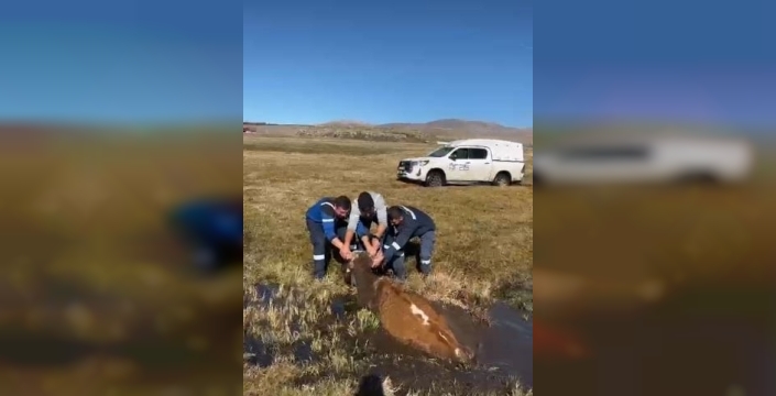 Edinilen bilgiye göre, büyükbaş hayvan köy merasında otlarken bataklığa saplandı. Bataklığa saplanan inek olduğu yere yığılıp kaldı. Ortakent Mahallesinde arızaya giden Aras Edaş ekipleri arazide çamura saplanmış bir ineği fark etti.