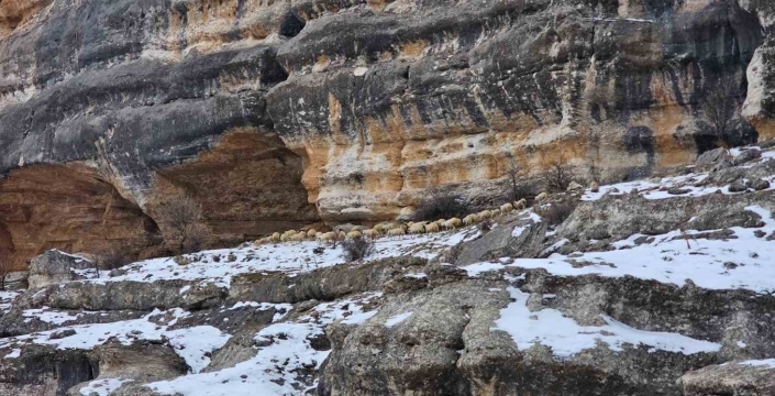 Kentte yoğun kar yağışına rağmen ahırlardan çıkarılan sürüler, zorlu arazi şartlarında yemleniyor. Karla kaplı yüksek kayalıklara götürülen hayvanların yolculuğu cep telefonu kamerasıyla görüntülendi.