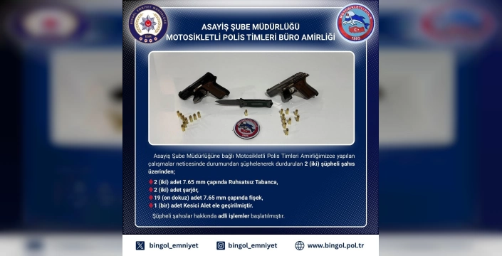 Yapılan üst aramasında 2 adet ruhsatsız tabanca, şarjör ve fişek ele geçirildi. Şüpheliler hakkında adli işlem başlatıldığı öğrenildi.