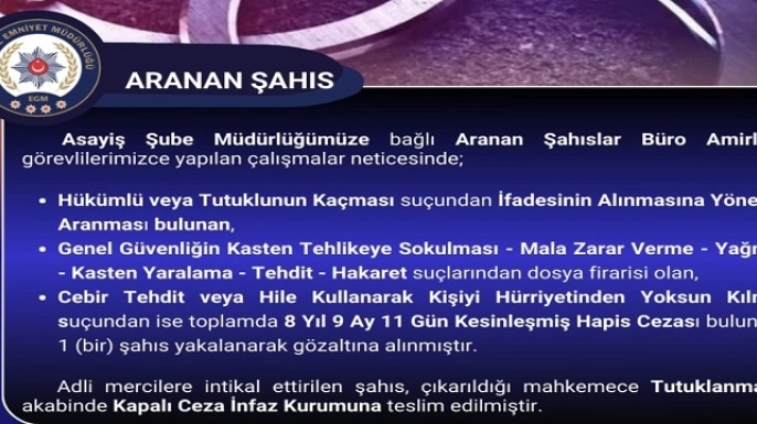 SERHED HABER - İl Emniyet Müdürlüğü ekipleri kesinleşmiş hapis cezası ile aranan şüphelilerin yakalalanması için çalışmalarını sürdürüyor. Bu çerçevede, ‘Cebir Tehdit veya Hile Kullanarak Kişiyi Hürriyetinden Yoksun Kılma’ suçundan toplamda 8 yıl 9 ay 11 gün kesinleşmiş hapis cezası bulunan 1 şahıs yakalanarak gözaltına alındı. Adliyeye sevk edilen şahıs, tutuklanarak cezaevine gönderildi.