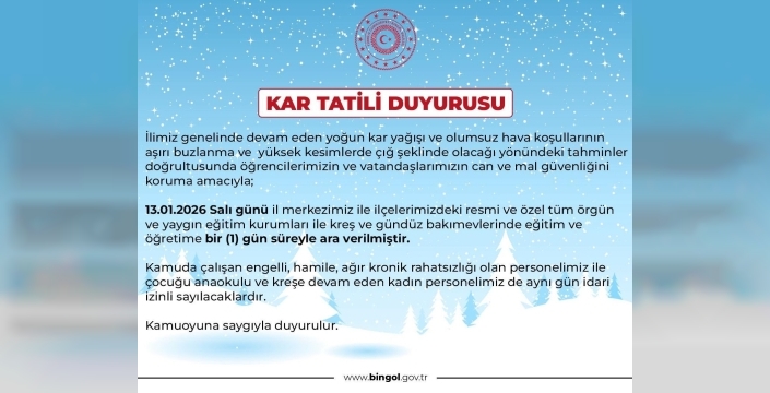 SERHED HABER - Bingöl Valiliği’nden yapılan açıklamada, "İlimiz genelinde devam eden yoğun kar yağışı ve olumsuz hava koşullarının aşırı buzlanma ve yüksek kesimlerde çığ şeklinde olacağı yönündeki tahminler doğrultusunda öğrencilerimizin ve vatandaşlarımızın can ve mal güvenliğini koruma amacıyla 13.01.2026 Salı günü il merkezimiz ile ilçelerimizdeki resmi ve özel tüm örgün ve yaygın eğitim kurumları ile kreş ve gündüz bakımevlerinde eğitim ve öğretime 1 gün süreyle ara verilmiştir. Kamuda çalışan engelli, hamile, ağır kronik rahatsızlığı olan personelimiz ile çocuğu anaokulu ve kreşe devam eden kadın personelimiz de aynı gün idari izinli sayılacaklardır" denildi.