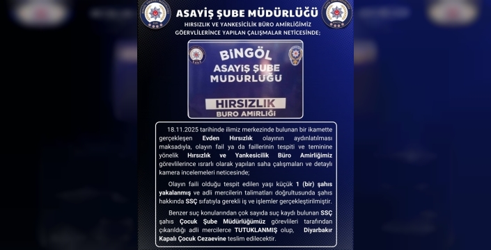 SERHED HABER - Bingöl İl Emniyet Müdürlüğü’nden yapılan açıklamada, "18.11.2025 tarihinde ilimiz merkezinde bulunan bir ikamette gerçekleşen Evden Hırsızlık olayının aydınlatılması maksadıyla, olayın fail ya da faillerinin tespiti ve teminine yönelik Hırsızlık ve Yankesicilik Büro Amirliğimiz görevlilerince ısrarlı olarak yapılan saha çalışmaları ve detaylı kamera incelemeleri neticesinde; olayın faili olduğu tespit edilen yaşı küçük 1 şahıs yakalanmış ve adli mercilerin talimatları doğrultusunda şahıs hakkında SSÇ sıfatıyla gerekli iş ve işlemler gerçekleştirilmiştir. Benzer suç konularından çok sayıda suç kaydı bulunan SSÇ şahıs Çocuk Şube Müdürlüğümüz görevlileri tarafından çıkarıldığı adli mercilerce tutuklanmış olup, Diyarbakır Kapalı Çocuk Cezaevine teslim edilecektir" denildi.