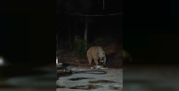 Şantiye alanına inen ayı, tepsi içerisindeki yiyecekleri yedi. O anlar cep telefonu ile kaydedildi. Uzun süre şantiye alanında bırakılan yiyecekleri yiyen ayı daha sonra gözden kayboldu.