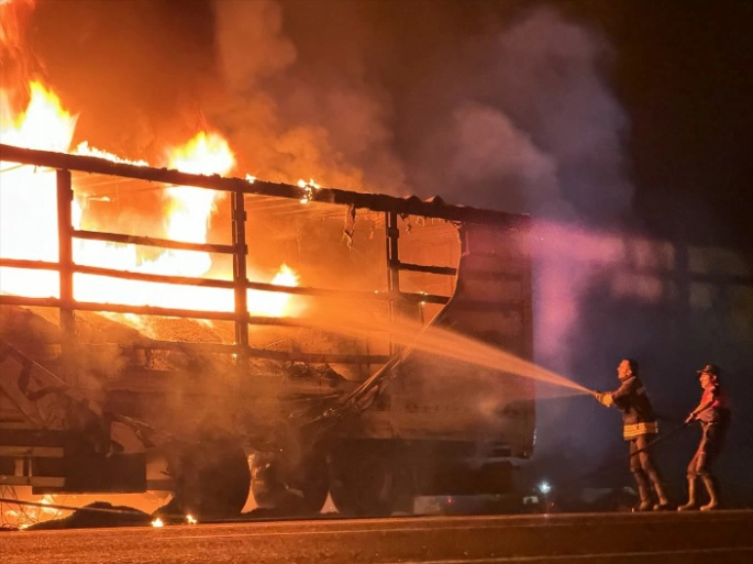 Yangını fark eden sürücü, tırı yolun kenarına çekerek durumu itfaiyeye bildirdi.