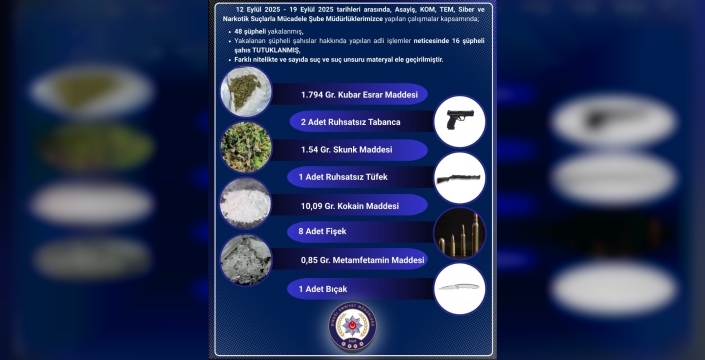 Çalışmalar kapsamında 1.794 gram kubar esrar, 1.54 gram skunk, 10.09 gram kokain, 0.85 gram metamfetamin, 2 adet ruhsatsız tabanca, 1 adet ruhsatsız tüfek, 8 adet fişek ve 1 adet bıçak ele geçirildiği bildirildi.