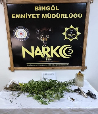 SERHED HABER - İl Emniyet Müdürlüğünden yapılan açıklamada, ''Bingöl Narkotik Suçlarla Mücadele Şube Müdürlüğünün çalışmaları kapsamında 19 kök Hint keneviri bitkisi, 6,55 gram esrar maddesi, uyuşturucu madde kullanmak için kullanılan 2 adet pet şişe, 2 adet tabaca, 2 adet tabancalara ait şarjör ele geçirilmiştir.