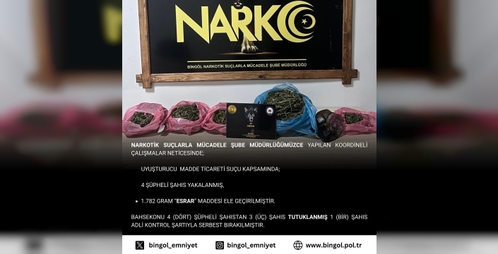 Bingöl’de düzenlenen uyuşturucu operasyonunda 1 kilo 782 gram esrar ele geçirilirken, gözaltına alınan 4 şüpheliden 3’ü çıkarıldıkları mahkemece tutuklandı.