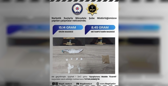SERHED HABER - Bingöl İl Emniyet Müdürlüğü Narkotik Suçlarla Mücadele Şube Müdürlüğü ekipleri, uyuşturucuyla mücadele çalışmalarını sürdürüyor. Bu çerçevede düzenlenen 2 ayrı operasyonda 15,14 gram eroin, 8,45 gram metamfetamin ve 96,75 gram esrar maddesi ele geçirildi. Operasyonda gözaltına alınan ve işlemlerinin ardından adliyeye sevk edilen şüphelinin "Uyuşturucu Madde Ticareti" suçundan tutuklanarak cezaevine gönderildiği bildirildi.