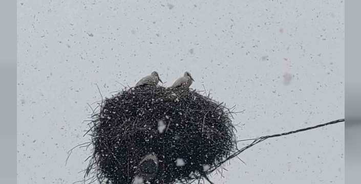 Baharın habercisi olarak bilinen leylekler, Bingöl’e erken gelince kar yağışına yakalandı.