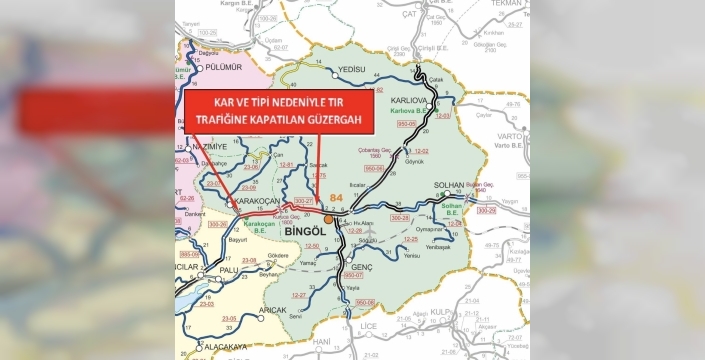 SERHED HABER - Bingöl Valiliği’nden yapılan açıklamada, "Bingöl-Elazığ Devlet Yolunun 0-51 km’leri arası (Bingöl Sancak kavşağı ile Karakoçan ayrım kavşağı arası) yoğun kar yağışı ve tipi nedeniyle saat 19.50 itibarıyla TIR trafiğine kapatılmıştır" denildi.