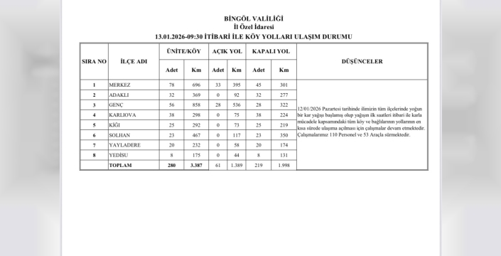 İl Özel İdaresi, 110 personel ve 53 araç ile çalışmalarını sürdürüyor. İl Özel İdaresi koordinesinde yürütülen çalışmalarda, karla mücadele kapsamındaki tüm köy ve bağlı yolların en kısa sürede ulaşıma açılması hedefleniyor.