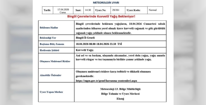 Meteoroloji 13. Bölge Müdürlüğü’nden yapılan açıklamada, "Bingöl çevrelerinde beklenen yağışların, 18.04.2026 Cumartesi sabah saatlerinden itibaren yerel olmak üzere kuvvetli sağanak ve gök gürültülü sağanak yağış şeklinde olması beklenmektedir. Oluşması muhtemel riskler; ani sel ve su baskını, ulaşımda aksamalar, yerel dolu yağışı, yağış anında kuvvetli rüzgar ve toz taşınımıyla birlikte çamur şeklinde yağıştır. Oluşması muhtemel risklere karşı tedbirli ve dikkatli olunması gerekmektedir" denildi.