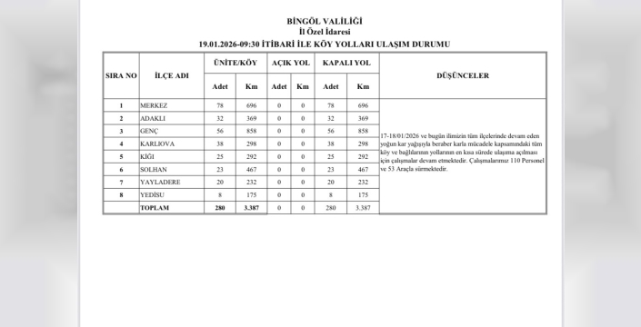 Yoğun kar yağışı sonrası karla mücadele kapsamında il genelinde bulunan 280 köy yolunun tamamı ulaşıma kapanırken, açık köy yolu bulunmadığı bildirildi.