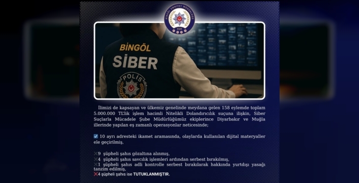 SERHED HABER - Bingöl İl Emniyet Müdürlüğü, ülke genelinde meydana gelen 158 eylemde toplam 5 milyon TL’lik işlem hacimli "nitelikli dolandırıcılık" suçuna ilişkin çalışma yaptı. Siber Suçlarla Mücadele Şube Müdürlüğü ekiplerince Diyarbakır ve Muğla illerinde yapılan eş zamanlı operasyonlar neticesinde; 10 ayrı adreste operasyon düzenlendi. Operasyonda 9 şüpheli gözaltına alındı. Bingöl’e getirilen şüphelilerden 4’ü savcılık tarafından biri ise adli kontrol kararı ile serbest bırakıldı. 4 şüpheli ise tutuklanarak cezaevine gönderildi.
