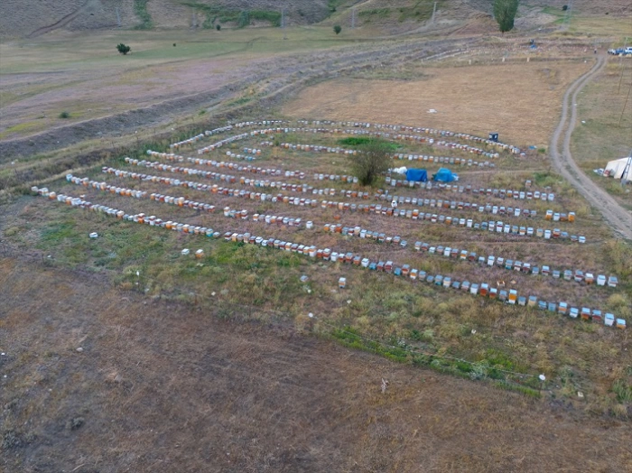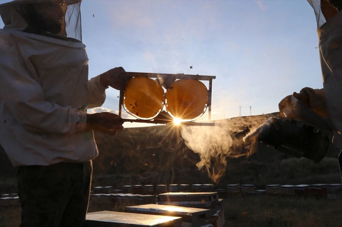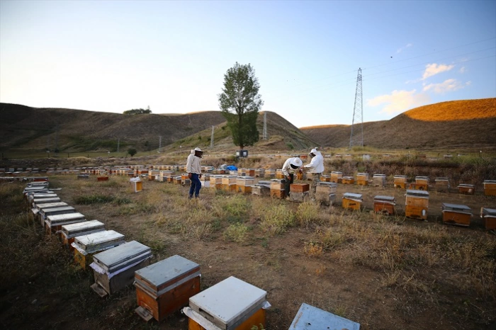 56 yaşındaki Turan Şenli'nin öncülüğündeki arıcı aile, Şeytan Dağları'nın eteğindeki yaklaşık 2 bin 250 rakımlı Ortaköy mevkisinde, bölgenin zengin florası içerisinde bal elde ediyor.