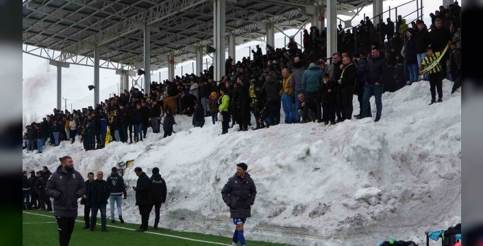 Soğuk havaya ve zorlu şartlara aldırış etmeyen taraftar, adeta karla kaplı bir seyir terası oluşturarak takımlarına destek verdi.