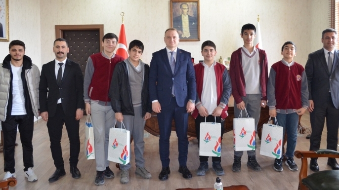 Okul Sporları kapsamında il birincisi olan öğrenciler, Bulanık İlçe Milli Eğitim Şube Müdürü Şakir Bozkurt ve okul yöneticileri ile birlikte Ömer Övünç Koşansu tarafından makamda kabul edildi.