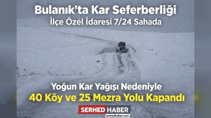 SERHED HABER- Muş’un Bulanık ilçesinde etkisini artıran kar yağışı, ulaşımda aksamalara neden oldu. Yoğun kar yağışı sonrası ilçeye bağlı 40 köy ve 25 mezra yolu ulaşıma kapanırken, Bulanık İlçe Özel İdaresi ekipleri yolların yeniden açılması için teyakkuz hâline geçti.