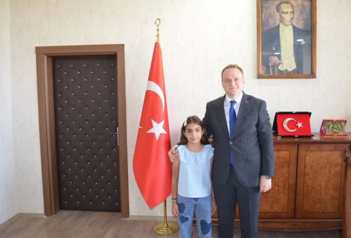 SERHED HABER- Bulanık Kaymakamlığı himayelerinde yürütülen “Bulanık’tan Darüşşafaka’ya” Projesi kapsamında açılan kursa katılarak sınava giren binlerce öğrenci arasından ilk 25’e girme başarısı gösteren 5. sınıf öğrencisi Fatmanur Çelik, Kaymakam Ömer Övünç Koşansu’yu makamında ziyaret etti.
