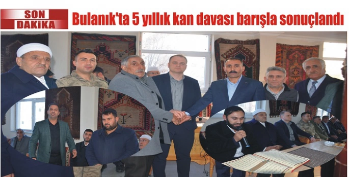 İki aile arasında 5 yıldır süren kan davasında, davası Bulanık Kaymakamı Ömer Övünç Koşansu, İlçe Emniyet Müdürü Aytaç Tefek, Kanaat önderi Şeh Faruk Kılınç’ın ve aile büyüklerinin girişimiyle barış yapılması için ortam sağlanarak tören organize edildi.