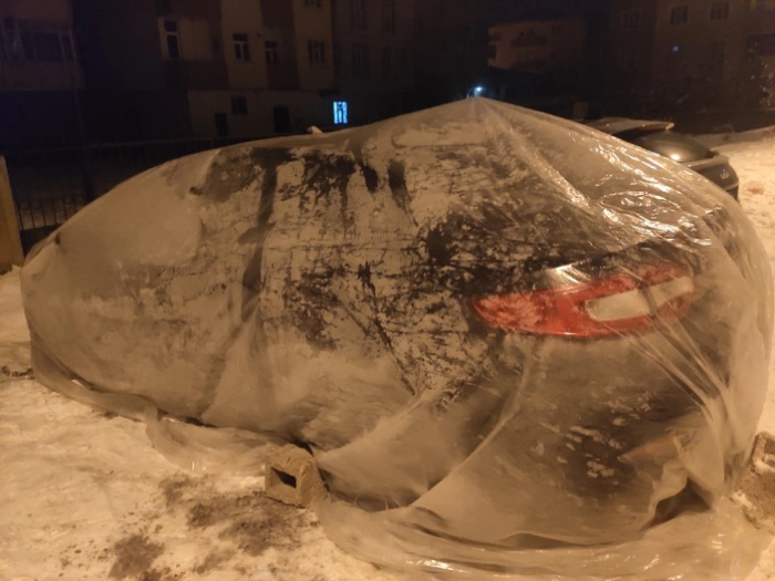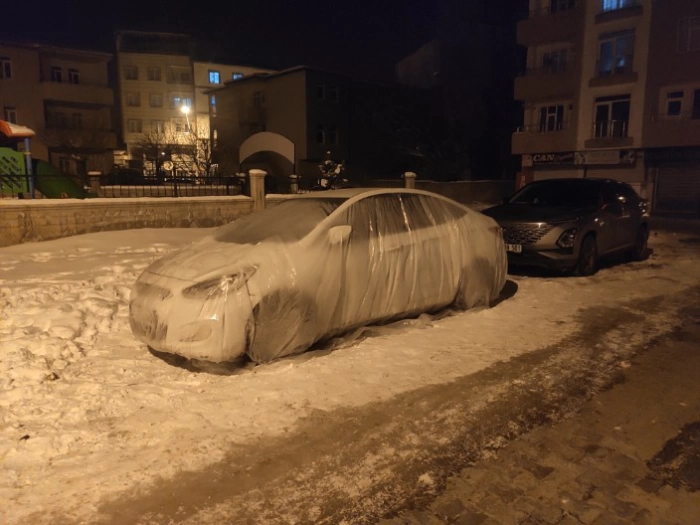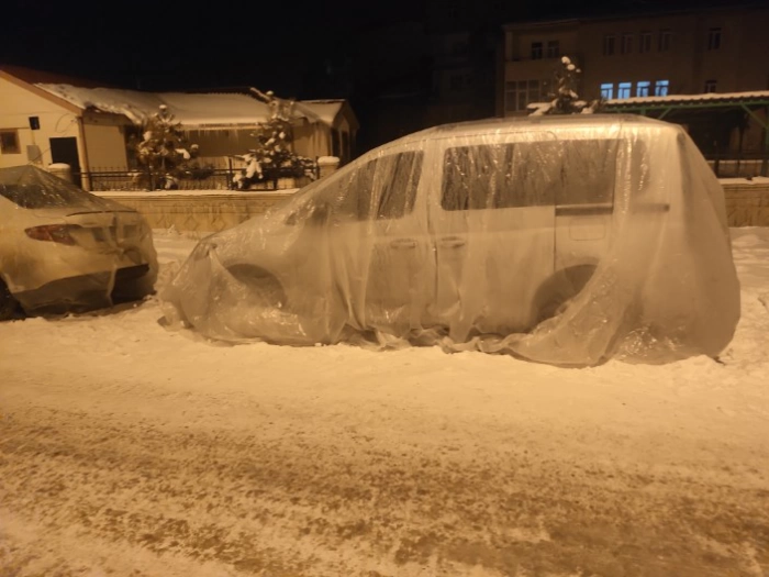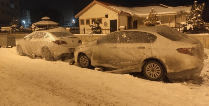 İlçede cok sayıda araç donarak çalışmazken, bazı vatandaşlar evlerinin ve iş yerlerinin önüne park ettikleri araçlarını donmaya karşı korumak için naylonla kaplayarak önlem almaya çalışıyor.