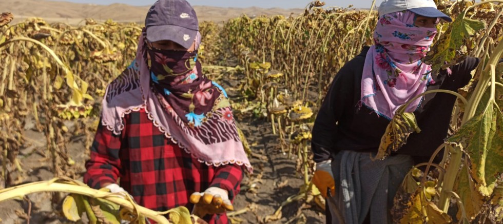 Çoğunluğu kadınlardan oluşan işçiler, sarıya boyanan tarlalarda insan boyunu aşan çerezlik ayçiçeklerini sıcak havada hasat ediyor.