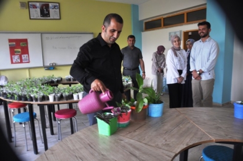 Projeyi yürüten öğretmen ve öğrenciler toplanan atık malzemelerden yaptıkları saksılara çam kozalağı ve çiçek tohumları ekerek üç ay içinde fidan yetiştirdiler.