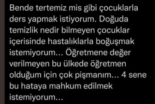 İşte o öğretmenin yaptığı o çirkin paylaşım: “ Bende tertemiz mis gibi çocuklarla ders yapmak istiyorum. Doğuda temizlik nedir bilmeyen çocuklar içerisinde hastalıklarla boğuşmak istemiyorum… Öğretmene değer verilmeyen bu ülkede öğretmen olduğum için çok pişmanım… 4 sene bu hataya mahkum edilmek istemiyorum…”