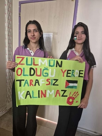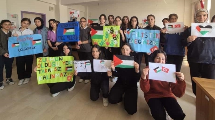 Öğrenciler sınıfta düzenlenen etkinlikte çizdikleri resimler ve dövizlerle zulme uğrayan Filistinli ve Gazzeli kardeşlerinin yanında oldukları mesajını verdi.