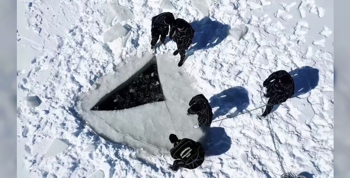 Ekipler buzla kaplı yüzeyi motorlu testere ile kesti ve nefes kesen bir dalış yaptı. Jandarma Genel Komutanlığı o anları sosyal medya hesabından paylaştı.