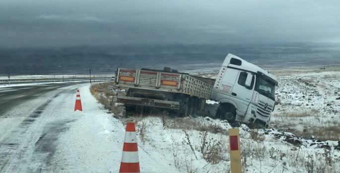 Iğdır'dan Kars'a seyir halindeki tır, Kars'a 8 kilometre mesafede buzlanan yolda kaymaya başladı.