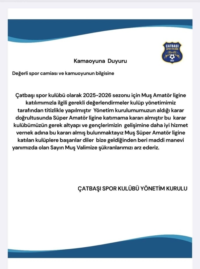 SERHED HABER- Çatbaşı Spor, bu sezon Muş Süper Amatör Ligi’nde mücadele etmeyecek.