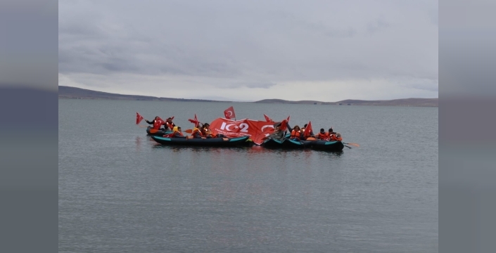 Kanolarıyla göl üzerinde gösteri yapan çocuklar, ellerinde Türk bayrakları ve Azerbaycan bayrakları ile Gazi Mustafa Kemal Atatürk’ün posterini açarak, Çıldır Gölü üzerinden Cumhuriyetin kurucusu Atatürk’ü selamladılar.