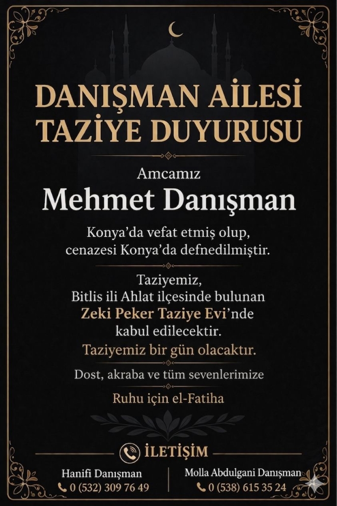 SERHED HABER - Muş Bulanık Söğütlü Köyünden Danışman Ailesi Büyüklerinden Mehmet Danışman Konya’da Vefat etmiştir Cenazesi Konya’da Defin edilecektir.