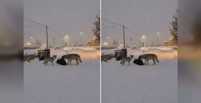 Kar kalınlığının artması ve doğada yiyecek bulmanın zorlaşmasıyla birlikte yerleşim yerlerine inen kurtlar, bir sokak üzerinde yiyecek ararken cep telefonu kamerasıyla kaydedildi. Görüntülerde kurtların karla kaplı yolda uzun süre dolaştığı ve çevreyi kontrol ettiği görüldü.