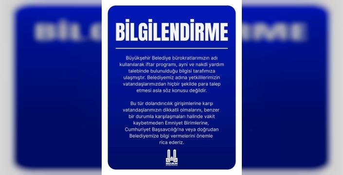 Erzurum Büyükşehir Belediyesi tarafından konu ile ilgili yapılan açıklamada şöyle denildi, " Büyükşehir Belediye bürokratlarımızın adı kullanılarak iftar programı, ayni ve nakdi yardım talebinde bulunulduğu bilgisi tarafımıza ulaşmıştır. Belediyemiz adına yetkililerimizin vatandaşlarımızdan hiçbir şekilde para talep etmesi asla söz konusu değildir.Bu tür dolandırıcılık girişimlerine karşı vatandaşlarımızın dikkatli olmalarını, benzer bir durumla karşılaşmaları halinde vakit kaybetmeden Emniyet Birimlerine, Cumhuriyet Başsavcılığı’na veya doğrudan Belediyemize bilgi vermelerini önemle rica ederiz"