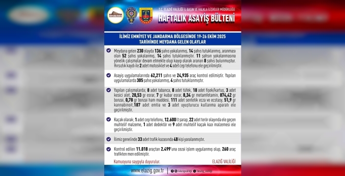 SERHED HABER - Elazığ Valiliği, 12-19 Ekim 2025 tarihleri arasındaki haftalık asayiş verilerini açıkladı. Kent genelinde meydana gelen 230 olayda 136 şüpheli yakalanırken, 14 kişi tutuklandı. Aranması olan 52 şahısta yakalanırken 14’ü tutuklandı. Çalışmalarda 62 bin 211 şahıs ve 24 bin 935 araç denetlenirken uygulamalarda 305 şahsın yakalandığı ve 4’ünün tutuklandığı bildirildi. Kontrol edilen araçlardan, 2 bin 499’une cezai işlem uygulanırken 260 araç da trafikten men edildi. Kent genelinde meydana gelen 33 adet trafik kazasında 48 kişinin yaralandığı aktarıldı.