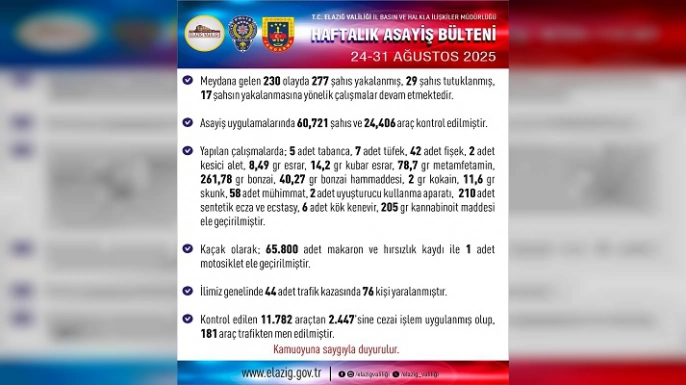 SERHED HABER - Elazığ Valiliği, 24-31 Ağustos 2025 tarihleri arasındaki haftalık asayiş verilerini açıkladı. Kent genelinde meydana gelen 230 olayda 277 kişi yakalanırken, 29 kişi tutuklandı. Çalışmalarda 60 bin 721 şahıs ve 24 bin 406 araç denetlendi. Kontrol edilen araçlardan, 2 bin 447’sine cezai işlem uygulanırken 181 araç da trafikten men edildi.